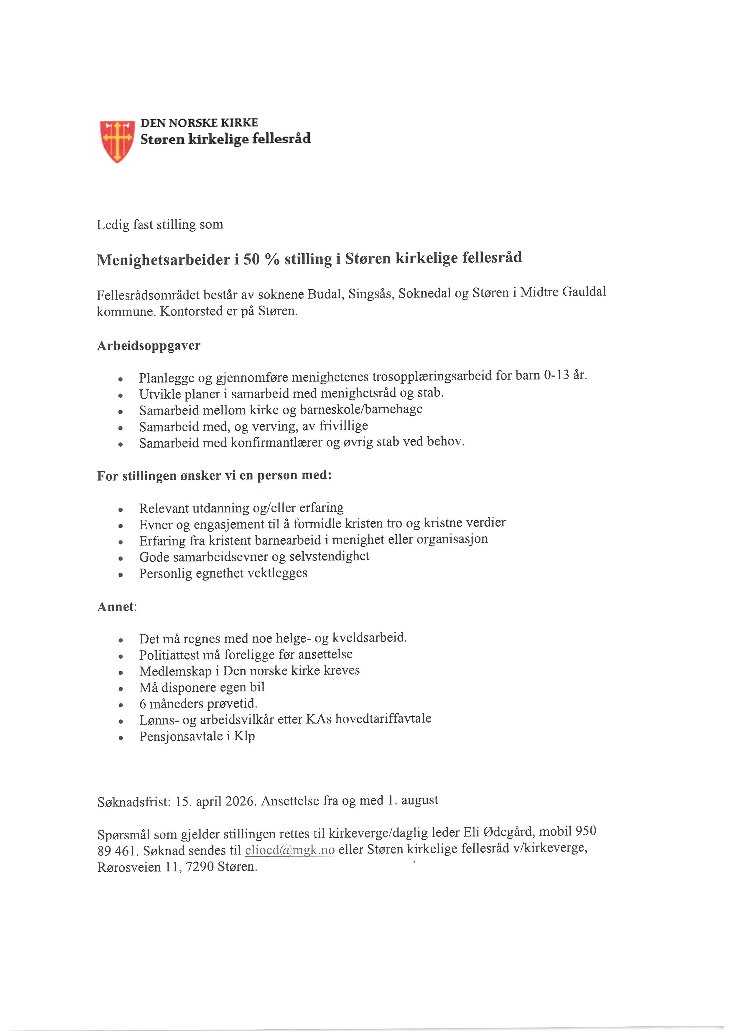 Ledig 50% stilling som menighetsarbeider i Støren kirkelige fellesråd